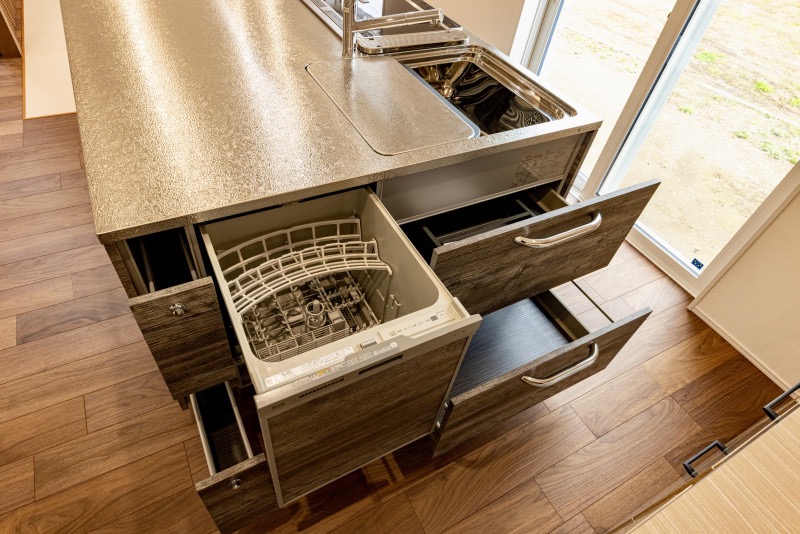 食洗機はリンナイ製「フロントオープン食洗機」を設置。大容量で家事が効率化でき、節水も期待できます。