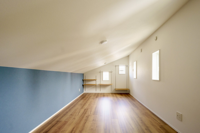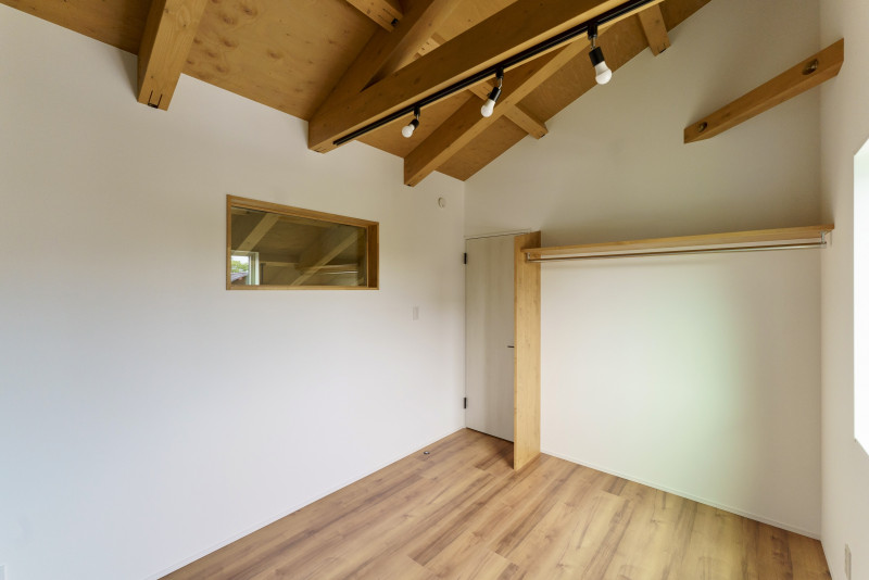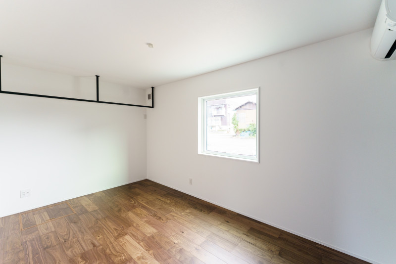 壁に設置した可動収納は、お子様の成長にあわせて服をかけたり、デスクにしたりと用途は様々。