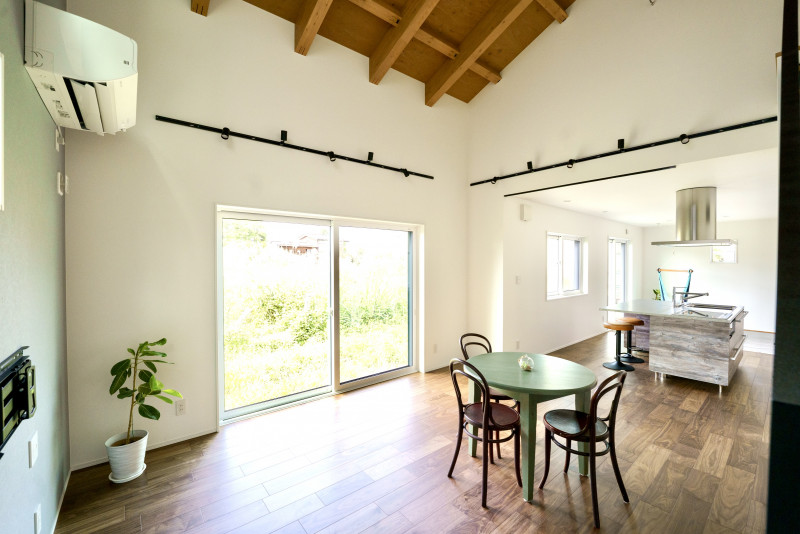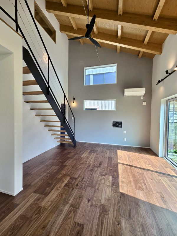 木のぬくもりとシーリングファン・照明がバランスよく調和したインテリアが特徴です。