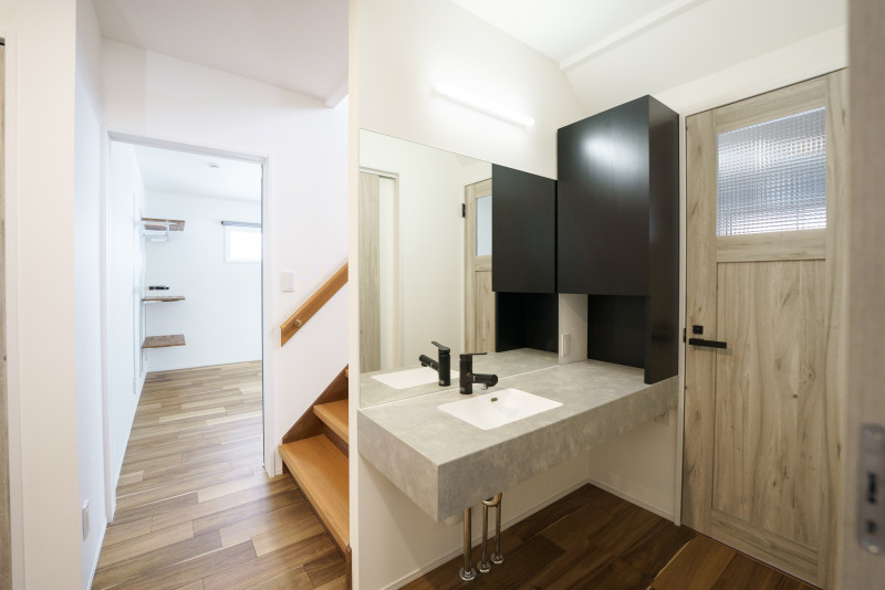 洗面台は、玄関ホールのインテリアに調和するアイカ工業の製品を採用。