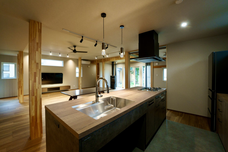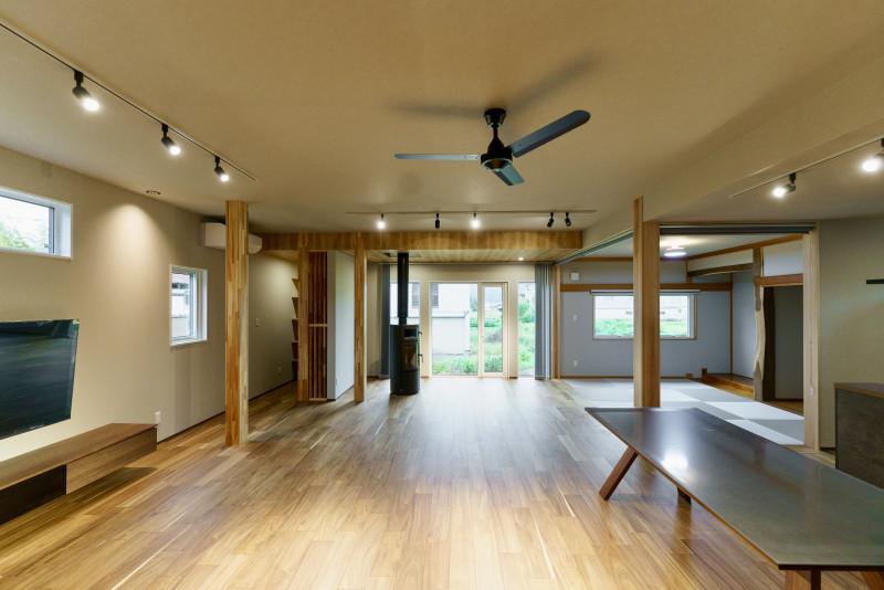 大きくて広い空間や薪ストーブ、子育て向きの家事動線など、ご家族の憧れを叶えた快適空間です。