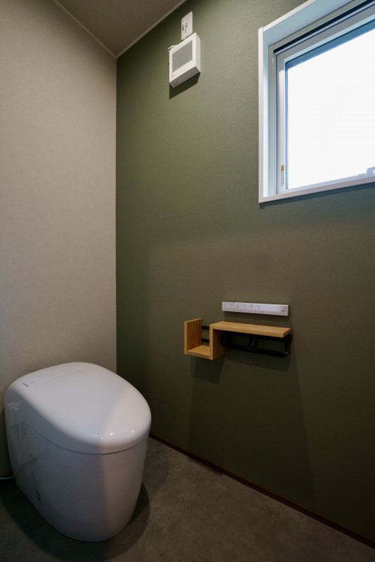 グリーンの壁と木のペーパーホルダーのデザインがポイント。
