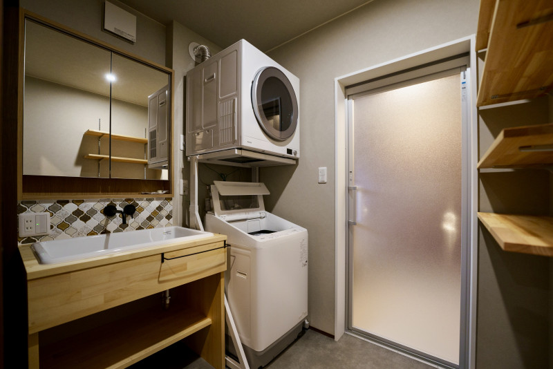 壁には稼働棚を造作し、洗剤やバスタオル等の収納スペースを確保しています。